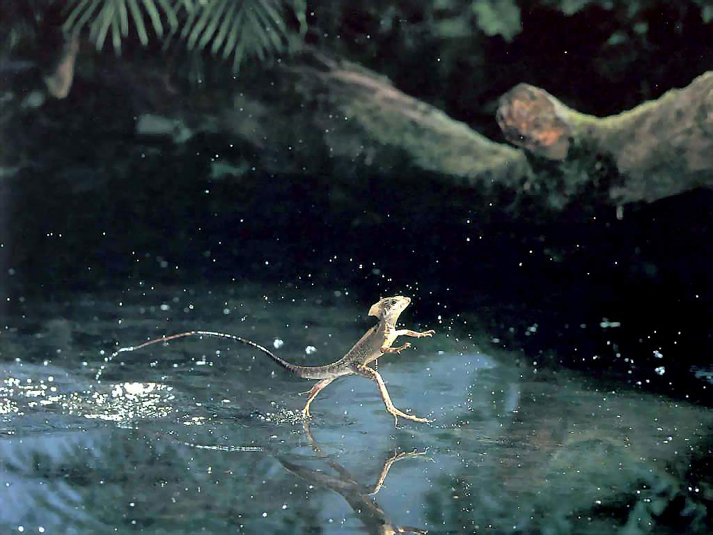 edge of water and continues sprinting. The lizard runs on only its hind legs in